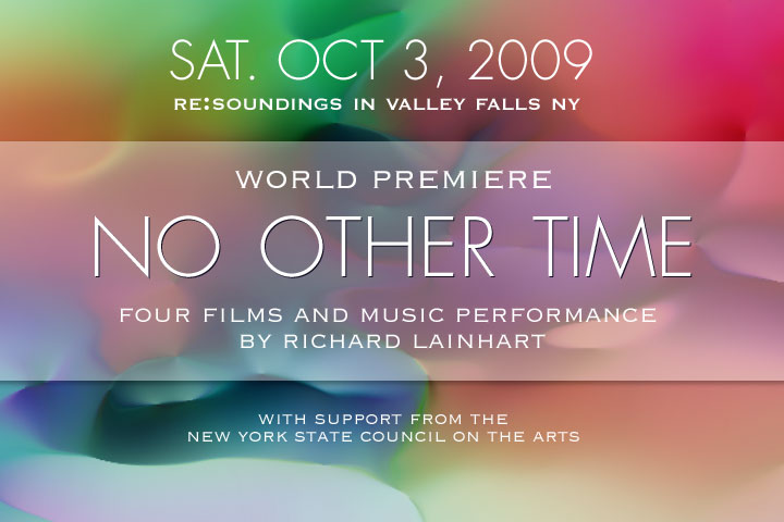 "On Saturday October 3, 2009, at Re:Soundings in Valley Falls, NY, Richard Lainhart will present the world premiere of 'No Other Time,' a full-length intermedia performance designed for a large reverberant space, combining live analog electronics performance in four-channel playback and high-definition computer-animated film projection. Lainhart will be accompanying his cycle of four new abstract films, whose imagery is inspired by the organic processes of nature, with his Buchla 200e/Haken Continuum modular analog synthesizer system."